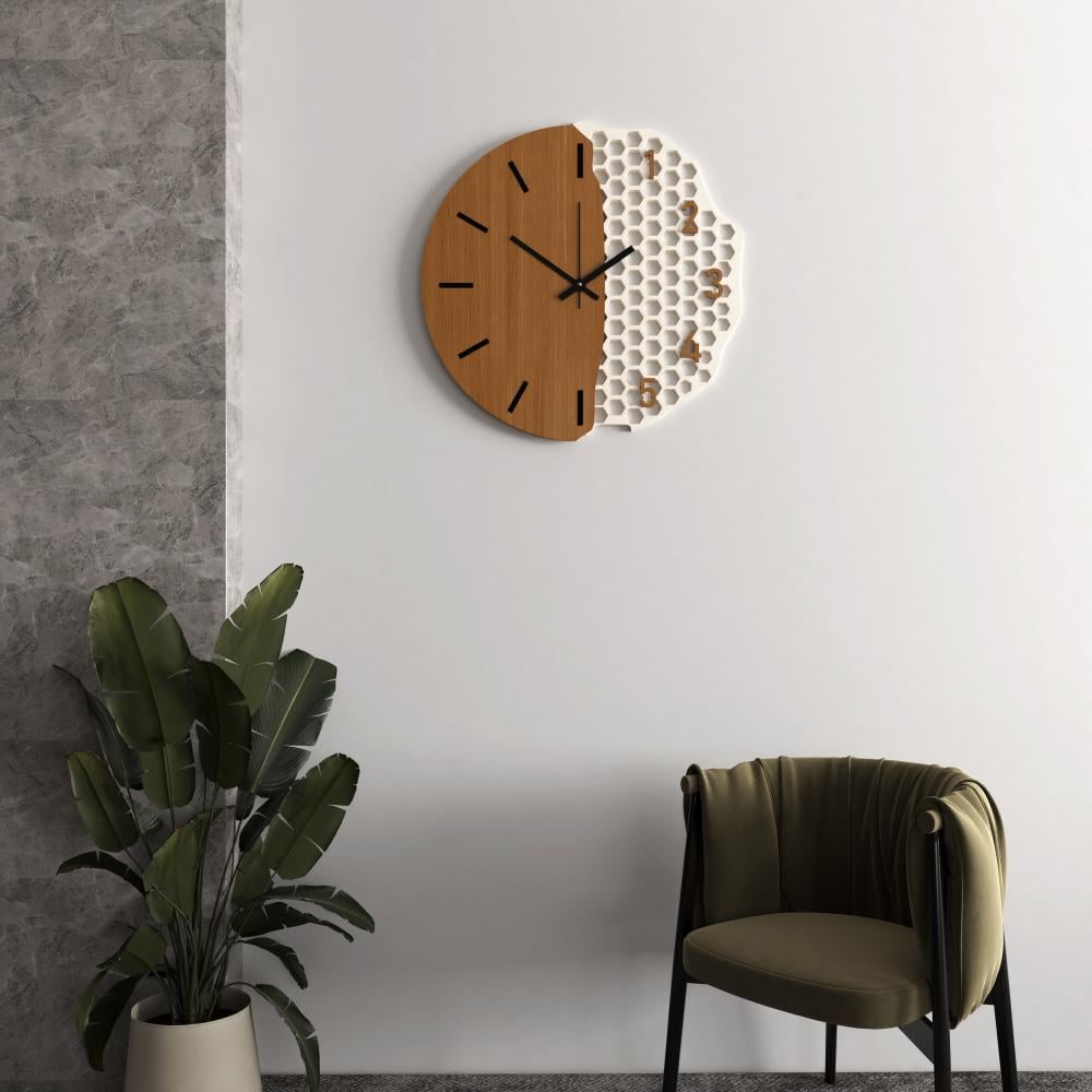 ساعة حائط خشبية بتصميم خلية نحل وهندسي عصري بسيط