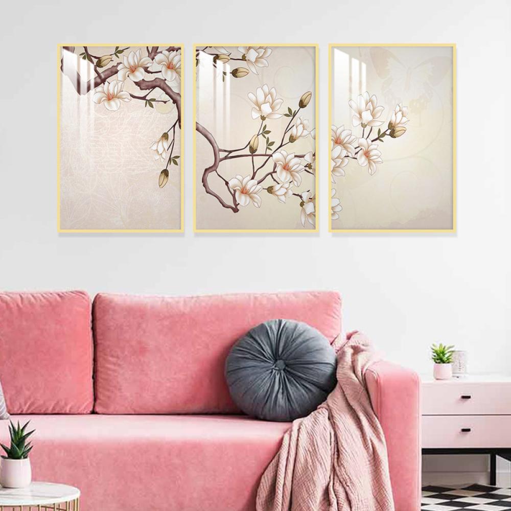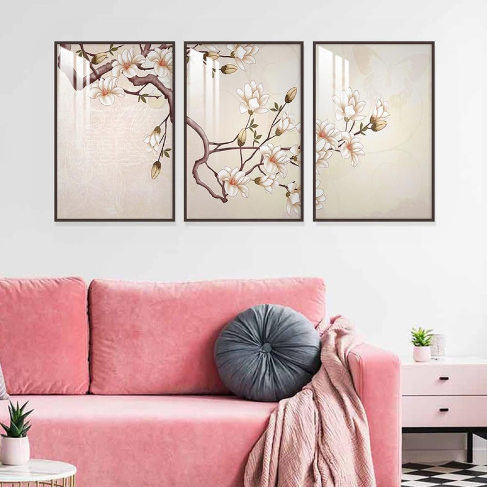 تفاصيل ثلاث لوحات جدارية بتصميم ورود مع برواز وأكريليك شفاف: