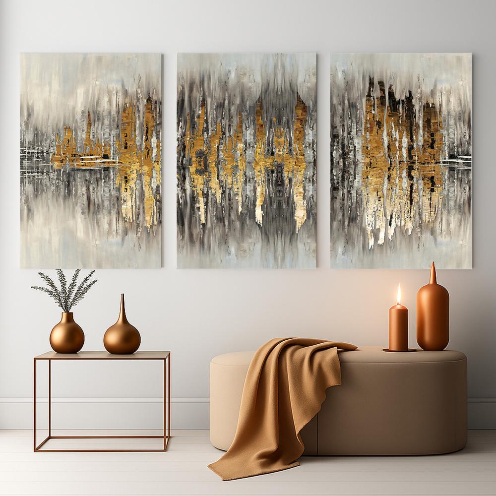 تفاصيل اللوحات الثلاثية الخشبية بتصميم تجريدي - ذهبي/رمادي: