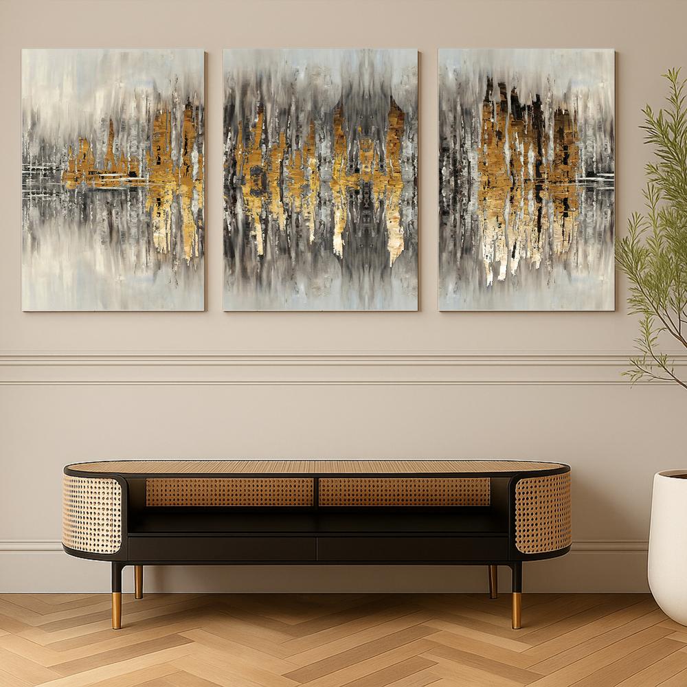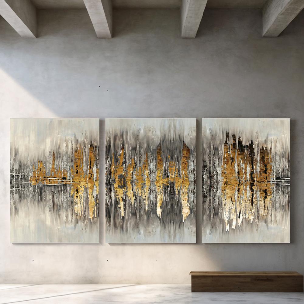 استحضر أجواء المدينة بروح فنية مع اللوحات الثلاثية الخشبية الفاخرة من متجر اربع جدران ذات التصميم التجريدي العصري. تجمع اللوحات بين الخطوط الرأسية وتدرجات ألوان الذهب والرماد لتخلق انعكاسًا بصريًا يشبه أفق مدينة في الغروب. اطلبها الآن!